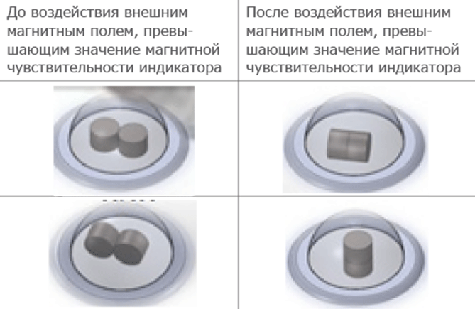 В случае воздействия магнитным полем на прибор учета с установленным индикатором, при превышении полем пороговых значений чувствительности индикатора, два магнита, размещенные в капсуле индикатора, соприкасающиеся в нормальном состоянии боками, соединятся основаниями.