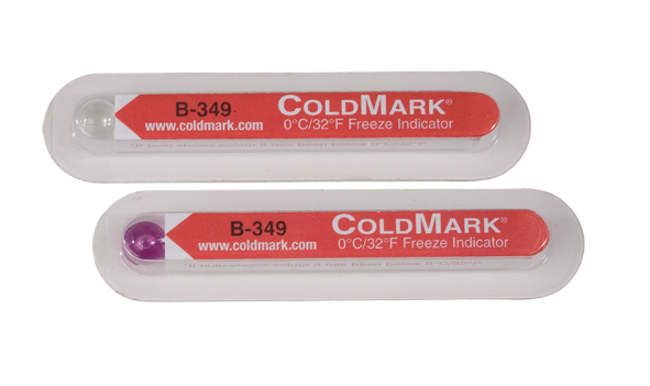 КолдМарк необратимо регистрирует понижение температуры ниже нормы. Срабатывание происходит в течение 30 минут с момента понижения температуры ниже допустимой и контрольный элемент окрашивается в интенсивный фиолетовый цвет. Окрашивание в светло-фиолетовый цвет означает, что падение температуры ниже допустимой произошло, но на очень короткий срок.