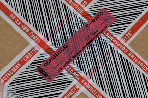 Упаковка запечатывается крест-накрест лентой Силтэк-Штрих со специальным дизайном. На месте перекрещивания устанавливаются номерные сигнальные устройства-наклейки.